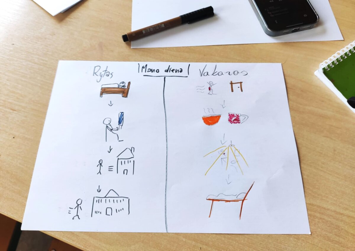 Integruotos pamokos metu mokiniai mokėsi, kaip naudoti vaizdus, simbolius ir schemas, kad lengviau suprastų ir įsimintų informaciją. Gimnazistai suprato, kad piešti ir mąstyti gali kiekvienas: svarbiausia ne meninis talentas, o gebėjimas išreikšti mintis vaizdais.