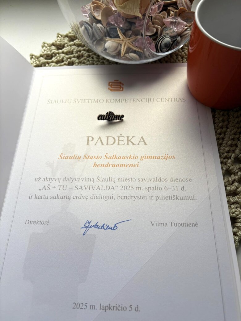 Lapkričio 5 d. Šiaulių švietimo kompetencijų centre įvyko baigiamasis renginys, kuriame buvo apibendrinti Savivaldos mėnesio rezultatai. Susirinkusieji dalijosi įžvalgomis, lūkesčiais ir ateities vizijomis, o aktyviausi dalyviai ir iniciatyvų organizatoriai buvo pagerbti padėkomis.