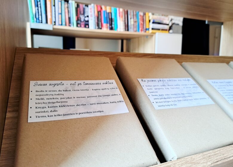Praėjusią savaitę gimnazijos bibliotekoje vyko originali ir netikėtus literatūrinius atradimus žadanti akcija „Aklas pasimatymas su knyga“. Jos metu mokiniai galėjo išsirinkti knygą ne pagal viršelį ar pavadinimą, o remdamiesi intriguojančiu, turinio neatskleidžiančiu aprašymu. Kiekviena knyga buvo paslėpta po paslaptingu įpakavimu, o ant jo puikavosi trumpos užuominos, kviečiančios leistis į skaitymo nuotykį. Tokia forma skatino mokinius atsiverti naujoms literatūrinėms patirtims ir atrasti kūrinius, kurių galbūt niekada nebūtų pasirinkę patys.