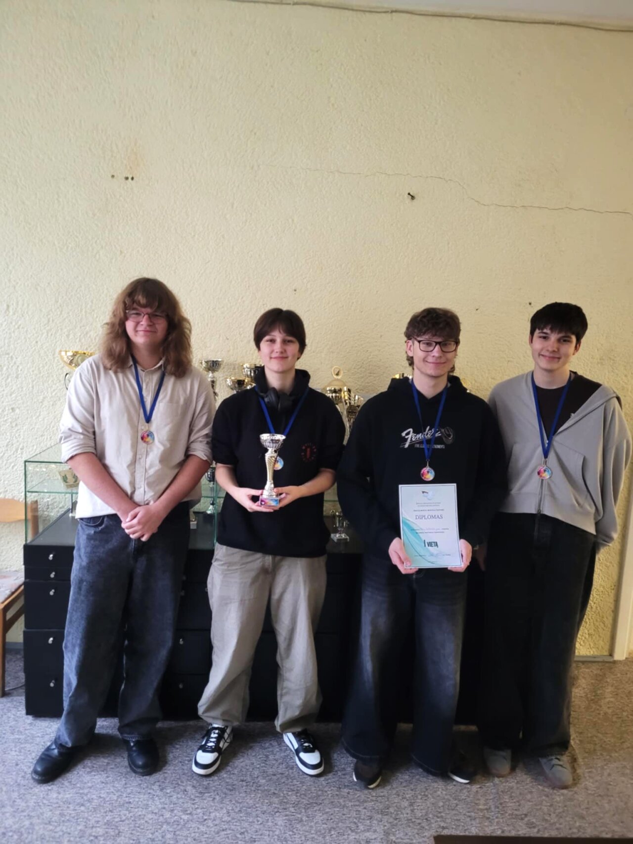 Lapkričio 24 d. mūsų gimnazijos 3c klasės mokiniai – Airidas, Adrijus, Eglė ir Pijus – eidami rikiais, žirgais, bokštais, karaliais ir karalienėmis juodai baltame langelių lauke garbingai iškovojo 1-ąją vietą!