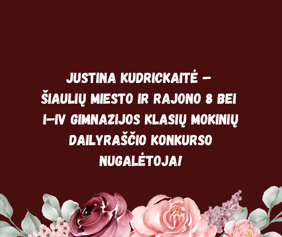 Džiaugiamės galėdami pasidalyti puikia žinia – mūsų gimnazijos IIIm kl. mokinė Justina Kudrickaitė III klasių grupėje iškovojo pirmąją vietą! Sveikiname Justiną ir linkime toliau puoselėti gražaus rašto tradicijas.