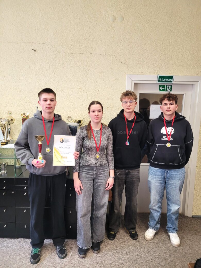 Sveikinimai gimnazijos komandos nariams Paulinai (3c kl.), Emiliui (1a kl.), Airidui (3d kl.) ir Denui (2c kl.).