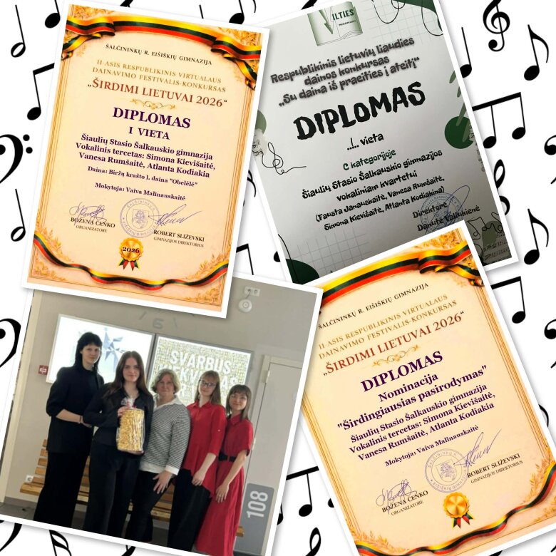 Respublikiniame dainavimo festivalyje-konkurse „Širdimi Lietuvai 2026“ merginų tercetas – Simona, Atlanta ir Vanesa – tapo I vietos diplomantėmis. Maža to, jų pasirodymas buvo įvertintas ir ypatinga nominacija „Širdingiausias atlikimas“, liudijančia ne tik techninį profesionalumą, bet ir emocinį ryšį su daina bei klausytojais.
