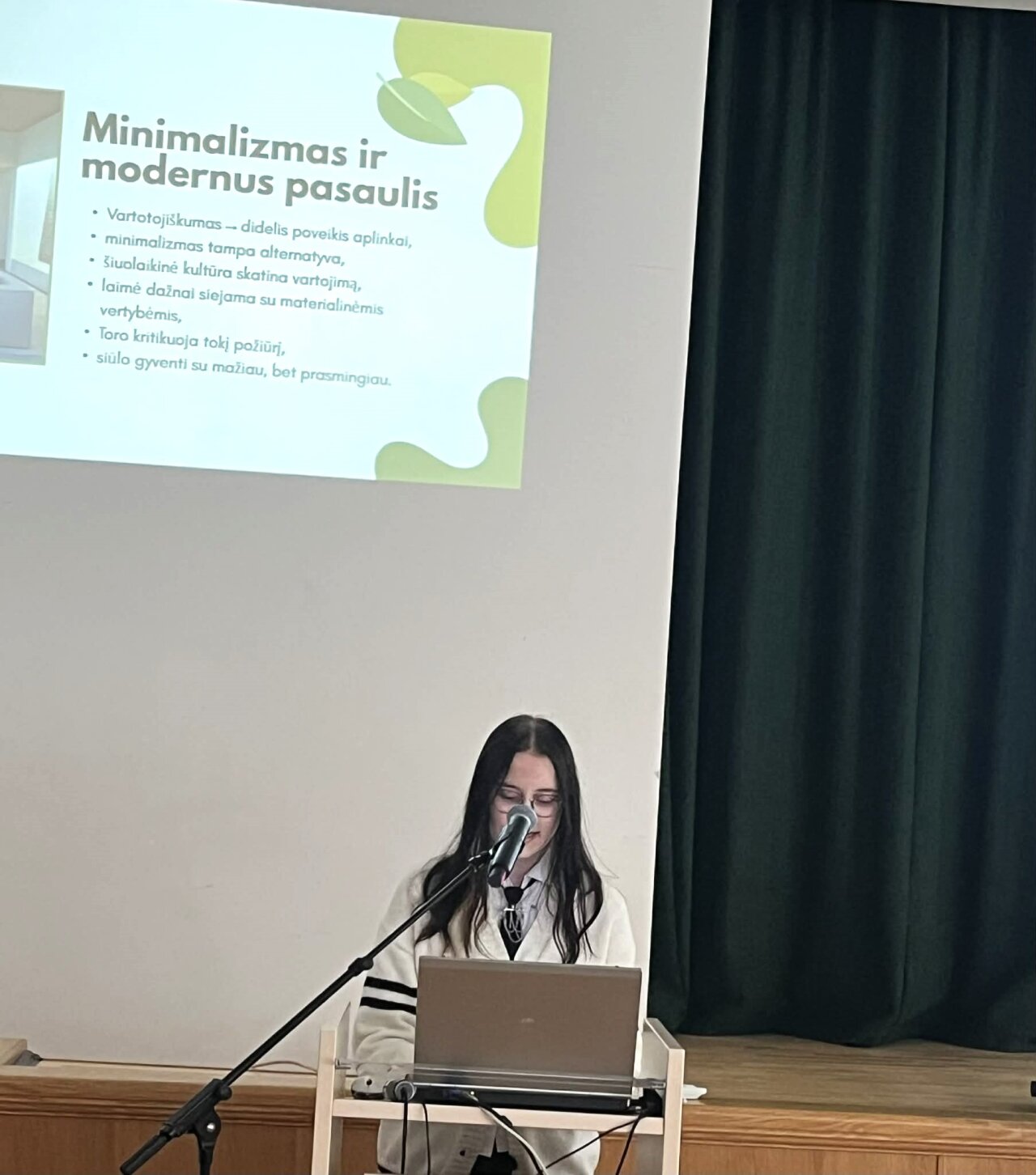 Šiame renginyje dalyvauja ir mūsų gimnazijos 4c klasės mokinė Ema Klimašauskaitė, kuri skaito pranešimą „Minimalizmas ir modernus pasaulis“. Pasirinkta tema ypač ryškiai atsiskleidžia amerikiečių rašytojo Henrio Deivido Toro romane „Gyvenimas miške“, kur minimalizmo idėjos tampa atsvara vartotojiškam gyvenimo būdui ir kviečiama grįžti prie sąmoningo santykio su gamta.