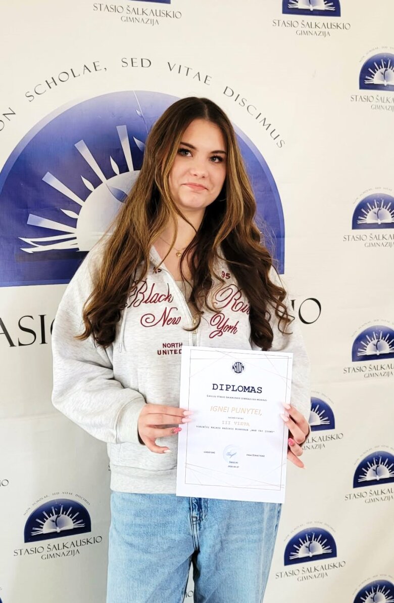 Nuoširdžiai sveikiname IIa klasės gimnazistę Ignę Punytę, Šiaulių miesto 8–12 klasių mokinių rašinio vokiečių kalba konkurse pelniusią III vietą. Tai gražus ir reikšmingas pasiekimas, atspindintis ne tik geras užsienio kalbos žinias, bet ir gebėjimą aiškiai, kūrybiškai perteikti mintis raštu.