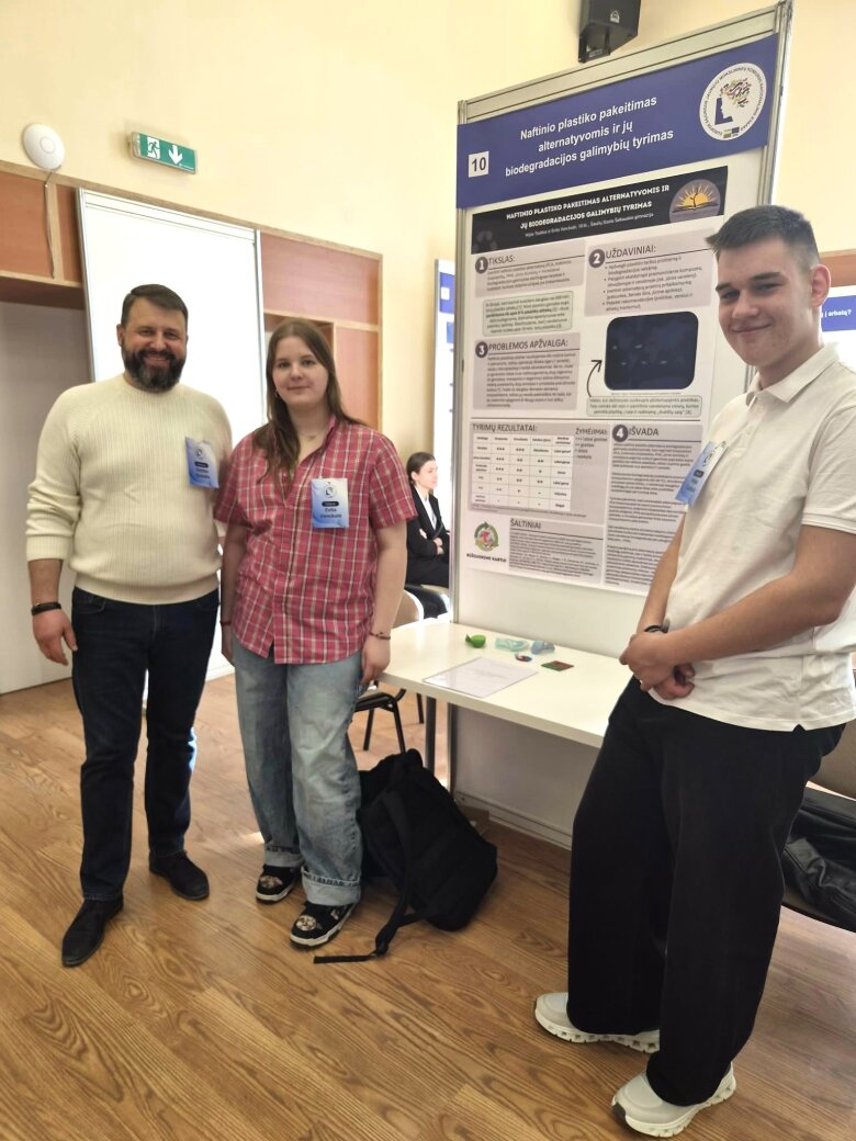 Mokiniai pristatė mokslinį tiriamąjį darbą „Naftinio plastiko pakeitimas alternatyvomis ir jų biodegradacijos galimybių tyrimas“, kuriame nagrinėjo aplinkai itin aktualią problemą – plastiko taršą ir galimus tvaresnius sprendimus. Tyrimas išsiskyrė moksline argumentacija, praktiniu aktualumu bei jaunatvišku smalsumu ieškant alternatyvų.