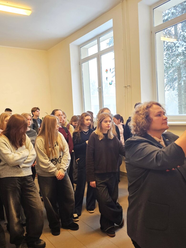 Šiandien gimnazijos mokiniai antrąją pamoką pradėjo neįprastai – susirinko į bendrą pamoką, skirtą paminėti kiekvienam lietuviui itin reikšmingą datą – Vasario 16-ąją, Lietuvos valstybės atkūrimo dieną.